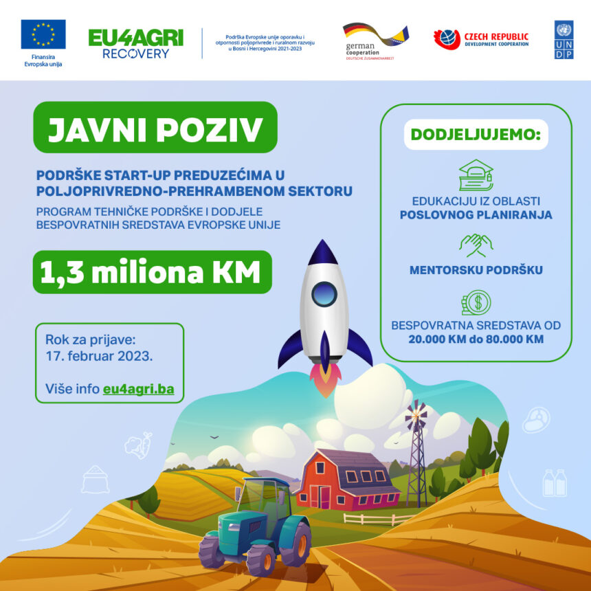 U okviru projekta EU4AGRI-Recovery i EU4BusinessRecovery koje finansiraju Evropska unija i Savezna Republika Njemačka, objavljen je Javni poziv za dodjelu bespovratnih sredstava u svrhu podrške start-up preduzeća u poljoprivredno-prehrambenom sektoru u Bosni i Hercegovini.